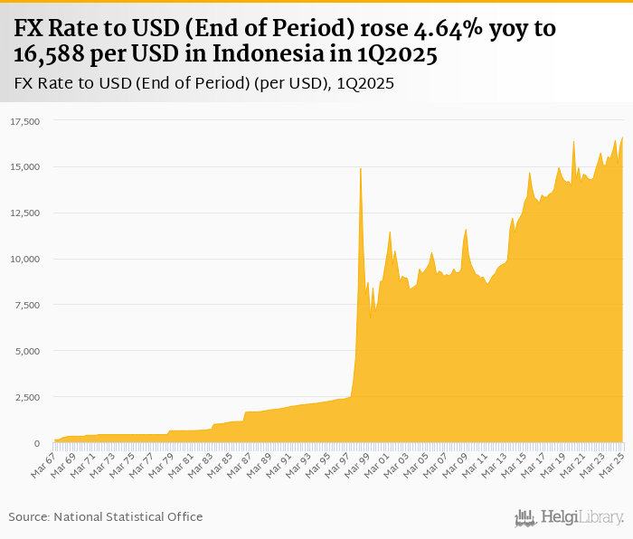 FX rate to USD at the end of period rose 4.64% yoy to 16,588 per USD in Indonesia in 1Q2025, according to the National Statistical Office. This is 2.64% more than in the previous quarter.