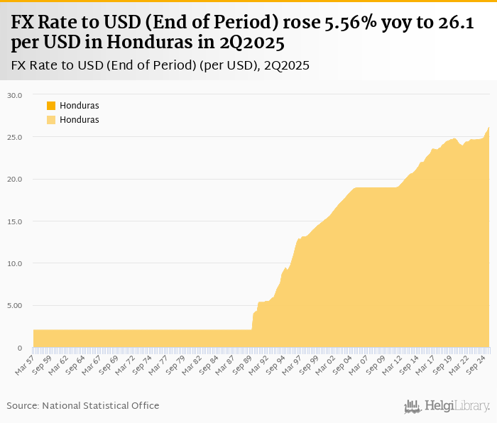 FX rate to USD at the end of period rose 5.56% yoy to 26.1 per USD in Honduras in 2Q2025, according to the National Statistical Office. This is 1.94% more than in the previous quarter.