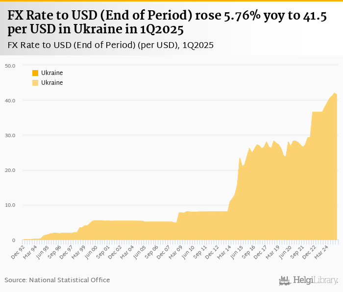 FX rate to USD at the end of period rose 5.76% yoy to 41.5 per USD in Ukraine in 1Q2025, according to the National Statistical Office. This is 1.33% less than in the previous quarter.