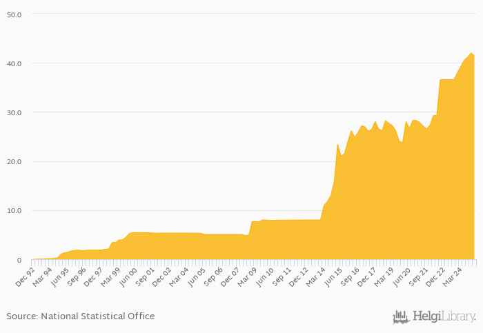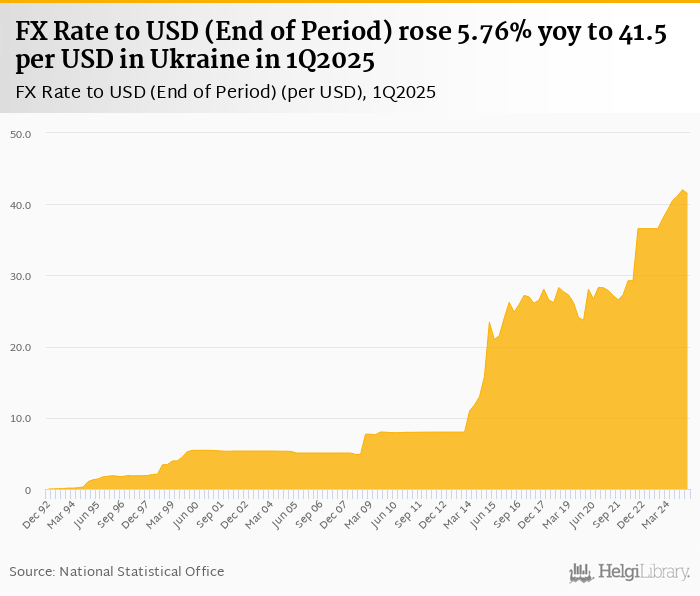 FX rate to USD at the end of period rose 5.76% yoy to 41.5 per USD in Ukraine in 1Q2025, according to the National Statistical Office. This is 1.33% less than in the previous quarter.