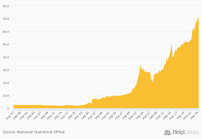Historically, FX rate to USD at the end of period in Gambia reached an all time high of 71.1 per USD in 1Q2025 and an all time low of 1.55 per USD in 2Q1973.