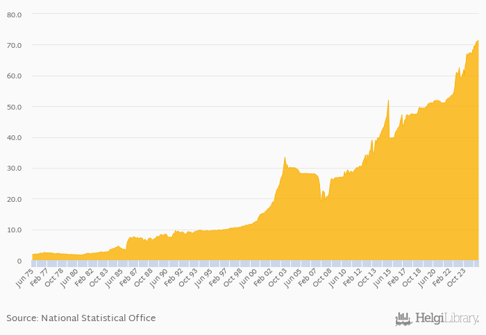 Historically, FX rate to USD at the end of period in Gambia reached an all time high of 71.5 per USD in May 2025 and an all time low of 1.55 per USD in June 1973.