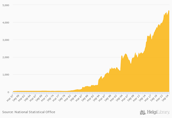 FX rate to USD at the end of period rose 6.50% yoy to 4,636 per USD in Madagascar in 1Q2025, according to the National Statistical Office. This is 1.20% less than in the previous quarter.