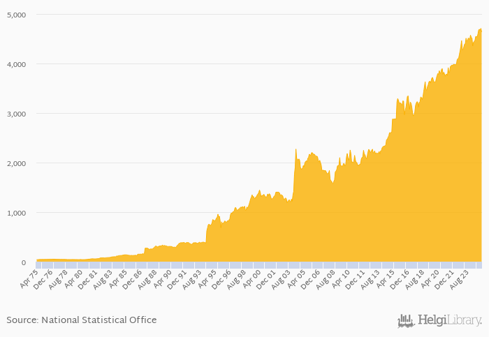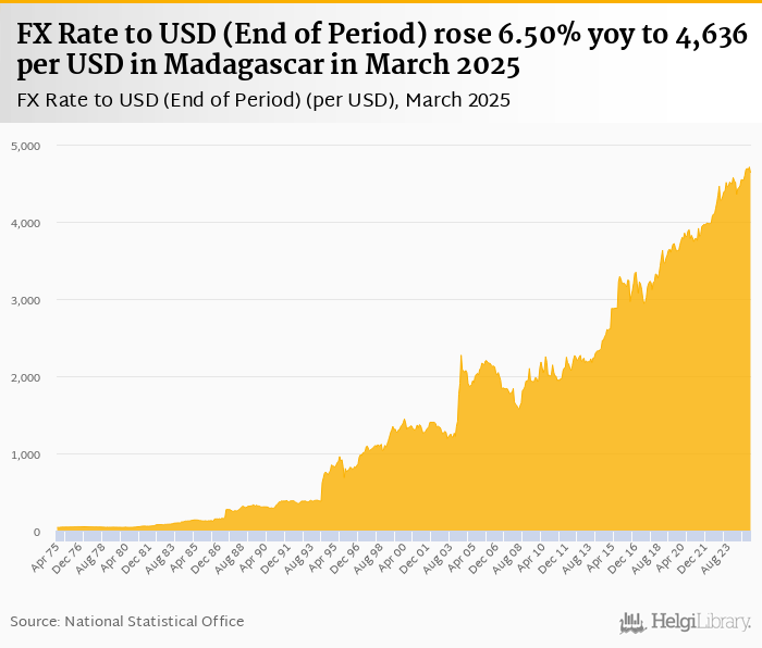 FX rate to USD at the end of period rose 6.50% yoy to 4,636 per USD in Madagascar in March 2025, according to the National Statistical Office. This is 1.57% less than in the previous month.