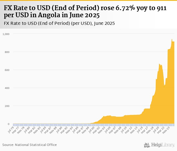 FX rate to USD at the end of period rose 6.72% yoy to 911 per USD in Angola in June 2025, according to the National Statistical Office. This is 0% more than in the previous month.