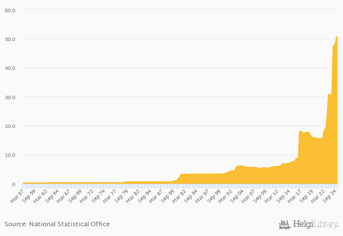 FX rate to USD at the end of period rose 7.14% yoy to 50.5 per USD in Egypt in 1Q2025, according to the National Statistical Office. This is 0.507% less than in the previous quarter.