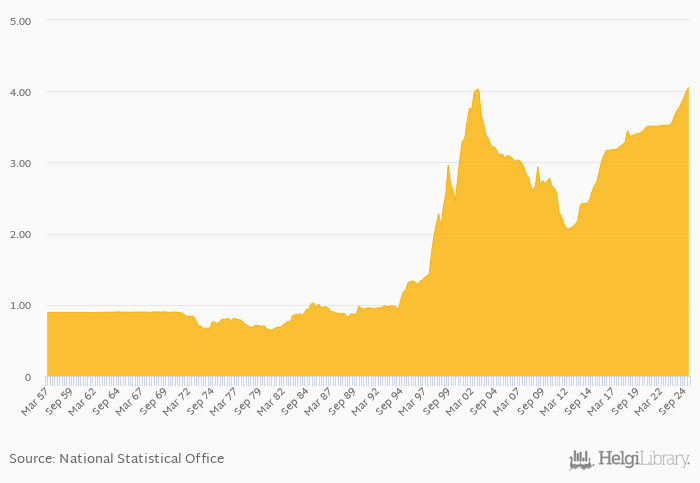 FX rate to USD at the end of period rose 7.59% yoy to 4.06 per USD in Papua New Guinea in 1Q2025, according to the National Statistical Office. This is 1.46% more than in the previous quarter.