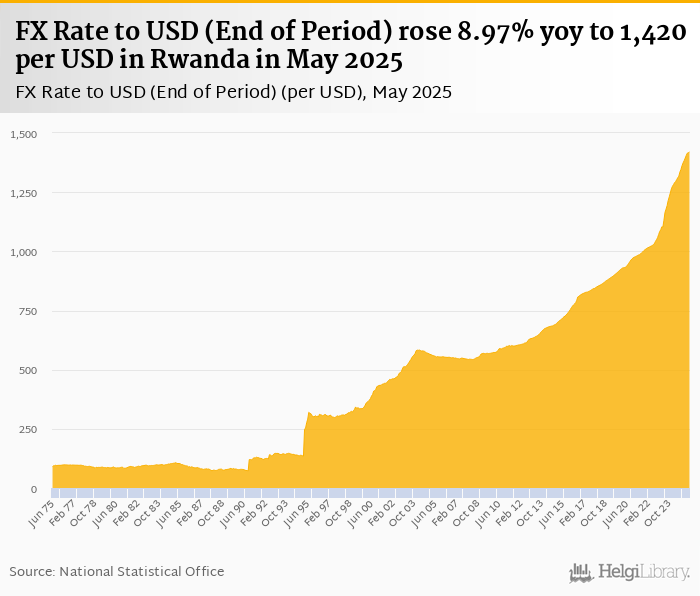FX rate to USD at the end of period rose 8.97% yoy to 1,420 per USD in Rwanda in May 2025, according to the National Statistical Office. This is 0.199% more than in the previous month.