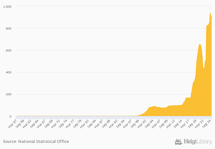 Historically, FX rate to USD at the end of period in Angola reached an all time high of 940 per USD in 3Q2024 and an all time low of < 0.001 per USD in 2Q1973.