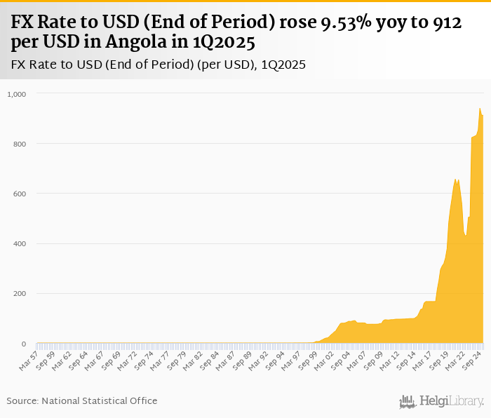 FX rate to USD at the end of period rose 9.53% yoy to 912 per USD in Angola in 1Q2025, according to the National Statistical Office. This is 0% more than in the previous quarter.