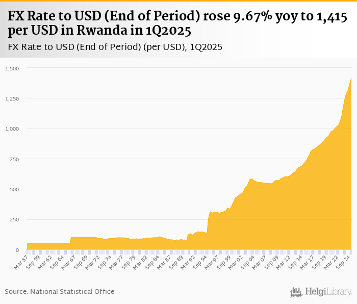 FX rate to USD at the end of period rose 9.67% yoy to 1,415 per USD in Rwanda in 1Q2025, according to the National Statistical Office. This is 2.31% more than in the previous quarter.