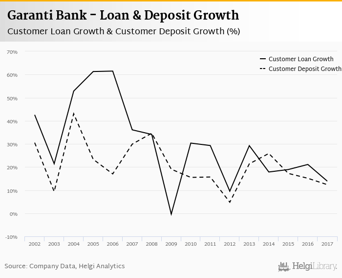 Garanti Bank's customer loan growth reached 13.9% in 2017, down from 21.1% compared to the previous year. Historically, the bank’s loans growth reached an all time high of 61.5% in 2006 and an all time low of -0.350% in 2009. In the last decade, the average annual loan growth amounted to 19.9%.