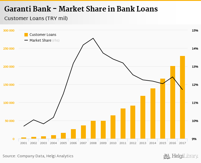 Garanti Bank accounted for 11.7% of all customer loans issued in Turkey at the end of 2017. Historically, the bank’s market share in customer loans reached an all time high of 14.6% in 2008 and an all time low of 9.68% in 2001.