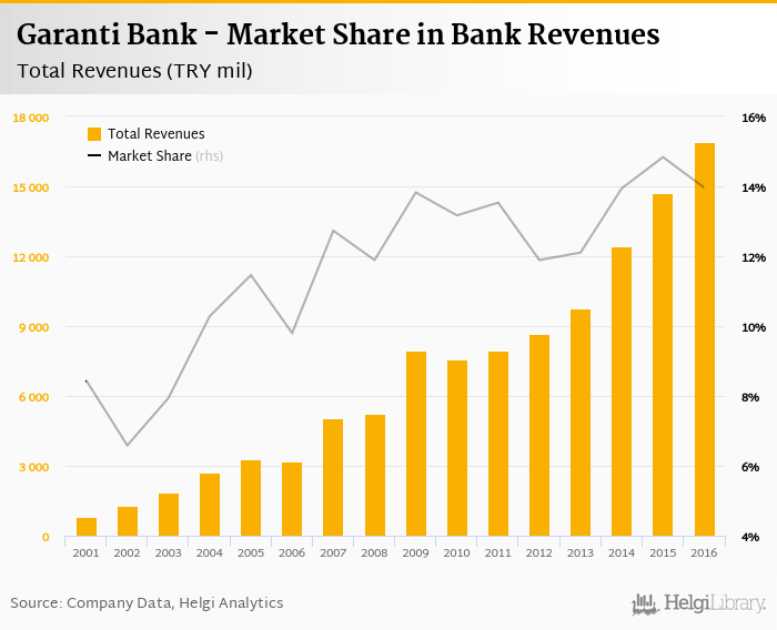 As a result, Garanti Bank accounted for 14.0% of all bank revenues generated by banks in Turkey in 2016. Historically, the bank’s market share in total revenues reached an all time high of 14.8% in 2015 and an all time low of 6.59% in 2002.
