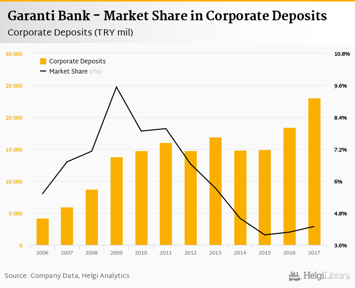 Garanti Bank accounted for 4.30% of all corporate deposits taken by banks in Turkey at the end of 2017. Historically, the bank’s market share in corporate deposits reached an all time high of 9.53% in 2009 and an all time low of 3.98% in 2015.