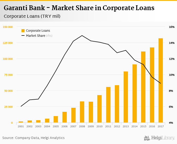 Garanti Bank accounted for 8.89% of all corporate loans issued in Turkey at the end of 2017. Historically, the bank’s market share in corporate loans reached an all time high of 14.9% in 2008 and an all time low of 6.00% in 2001.