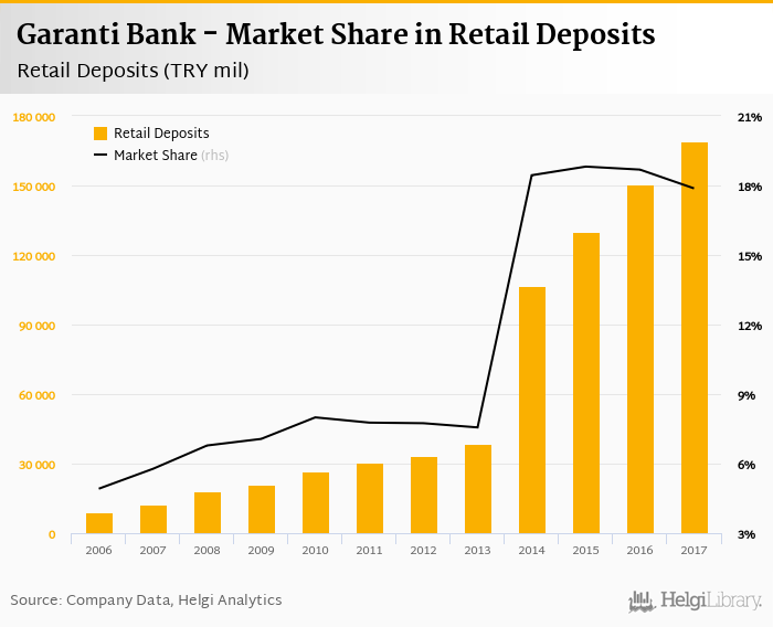 Garanti Bank accounted for 17.9% of all retail deposits taken by banks in Turkey at the end of 2017. Historically, the bank’s market share in retail deposits reached an all time high of 18.8% in 2015 and an all time low of 4.92% in 2006.