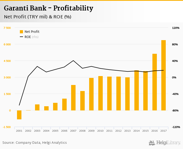 Garanti Bank made a net profit of TRY 6,388 mil in 2017, up 24.1% compared to the previous year. This implies a return on equity of 16.5%.