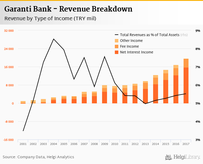 Comparing Garanti Bank with its closest peers, Isbank generated total revenues of 5.39% of assets in 2017, Yapi Kredi Bank operated with 4.28% revenue margin and VakifBank produced total income worth 4.47% of assets.
