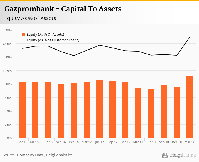 Gazprombank's Equity reached 13.0% of total assets in the 1Q2019, down from 13.1% for the previous year. As a share of net customer loans, the ratio amounted to 21.0% at the end of the first quarter of 2019.