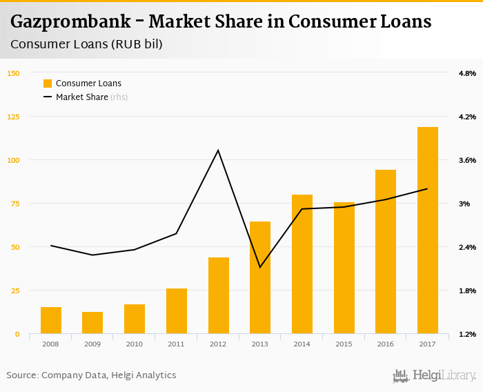 Gazprombank's consumer loans reached RUB 119 bil in 2017, up 26.0% compared to the previous year.
