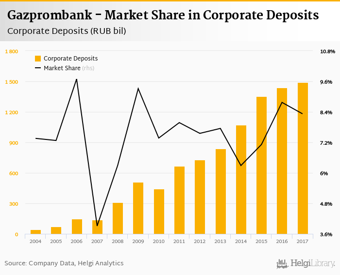 Gazprombank accounted for 8.32% of all corporate deposits taken by banks in Russia at the end of 2017. Historically, the bank’s market share in corporate deposits reached an all time high of 9.69% in 2006 and an all time low of 3.91% in 2007.