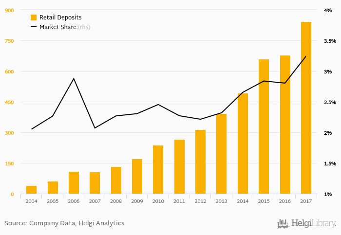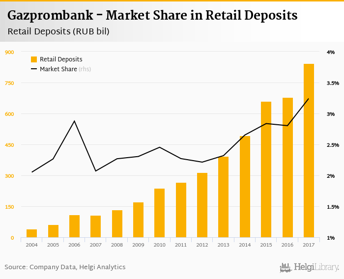 Gazprombank accounted for 3.24% of all retail deposits taken by banks in Russia at the end of 2017. Historically, the bank’s market share in retail deposits reached an all time high of 3.24% in 2017 and an all time low of 2.05% in 2004.