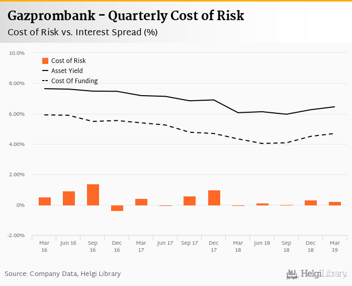 Gazprombank's Cost of Risk (loan loss provisions as % of total assets) amounted to 0.236% in the first quarter of 2019, down from 0.306% when compared to the previous quarter.