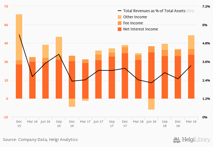 Bank's total revenues accounted for 3.34% total assets in the first quarter of 2019, up from 2.41% a year earlier.