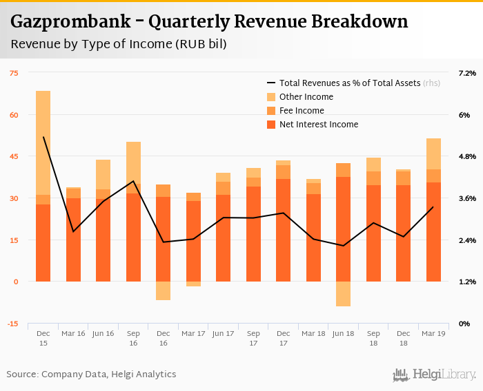When compared to bank's main peers, Sberbank generated total revenues of 6.04% of assets in 1Q2019 and VTB Bank operated with 3.53% revenue margin.