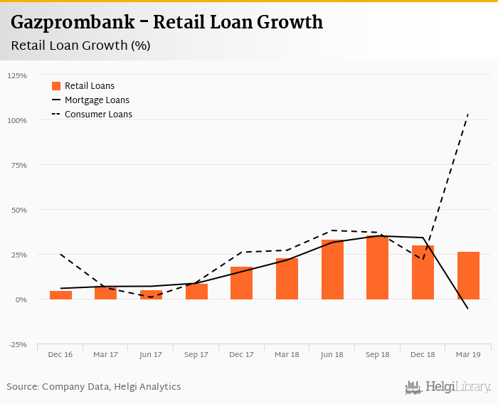 Mortgage loans fell 24.9% to RUB 272 bil in 2019-03-31 and accounted for 52.3% of the retail loan portfolio.