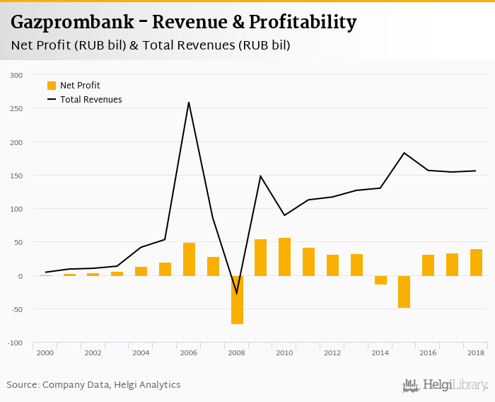 Comparing Gazprombank with its closest peers, Sberbank generated a net profit of RUB 833 bil with revenues of RUB 1,933 bil in 2018, VTB Bank netted RUB 182 bil (revenues of RUB 605 bil) and Alfa Bank announced a net profit of RUB 89.5 bil (revenues of RUB 213 bil).