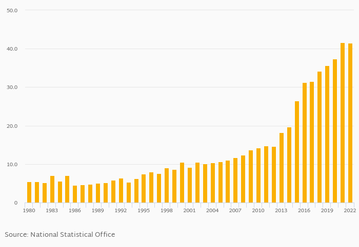 GDP per unit of energy use in PPP prices per kg of oil equivalent fell 0.321% to USD 41.5 in Malta in 2022, according to World Bank / EIA.