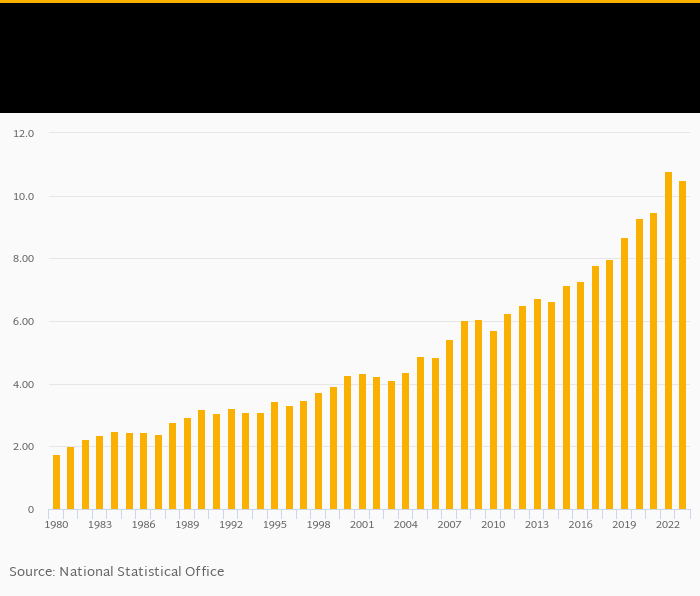 GDP per unit of energy use in PPP prices per kg of oil equivalent fell 2.73% to USD 10.5 in Finland in 2023, according to World Bank / EIA.