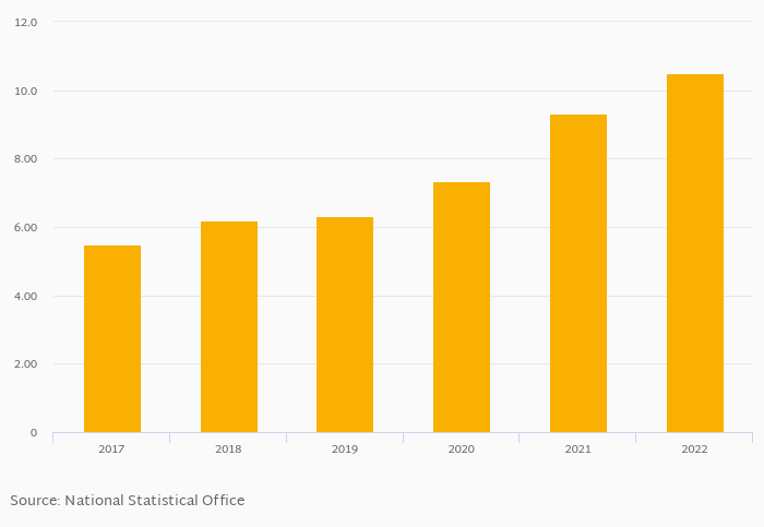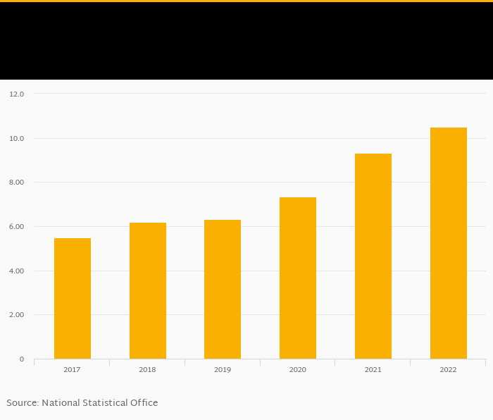 GDP per unit of energy use in PPP prices per kg of oil equivalent rose 12.5% to USD 10.5 in Syria in 2022, according to World Bank / EIA.