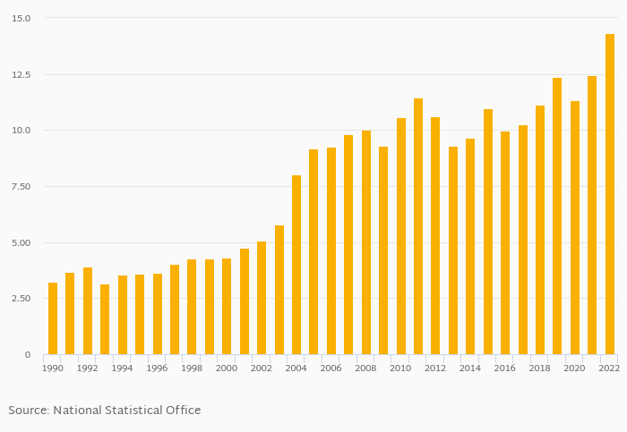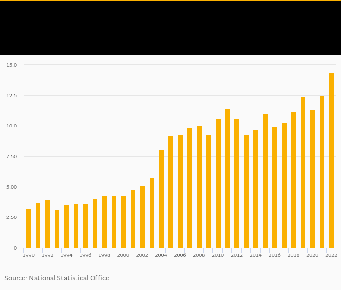 GDP per unit of energy use in PPP prices per kg of oil equivalent rose 15.3% to USD 14.3 in Chad in 2022, according to World Bank / EIA.