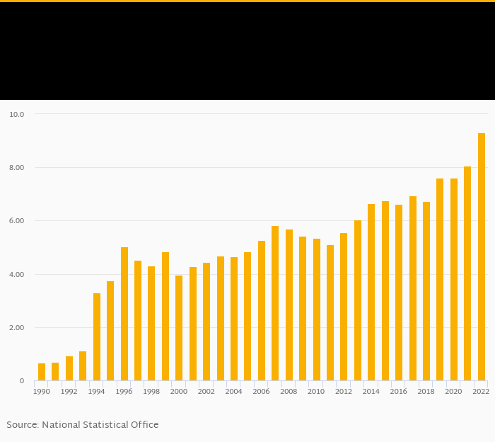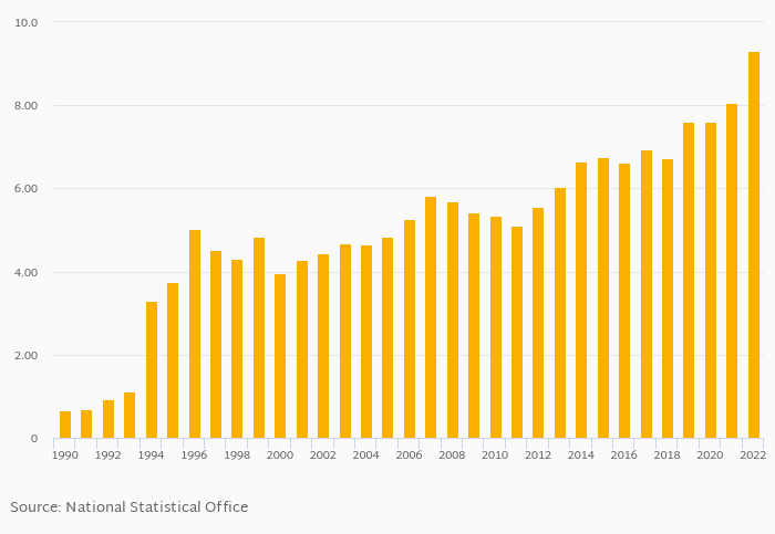 GDP per unit of energy use in PPP prices per kg of oil equivalent rose 15.3% to USD 9.30 in Bosnia and Herzegovina in 2022, according to World Bank / EIA.