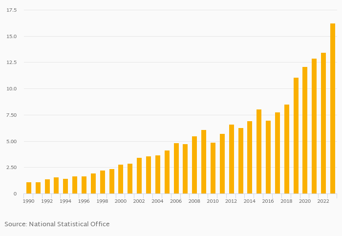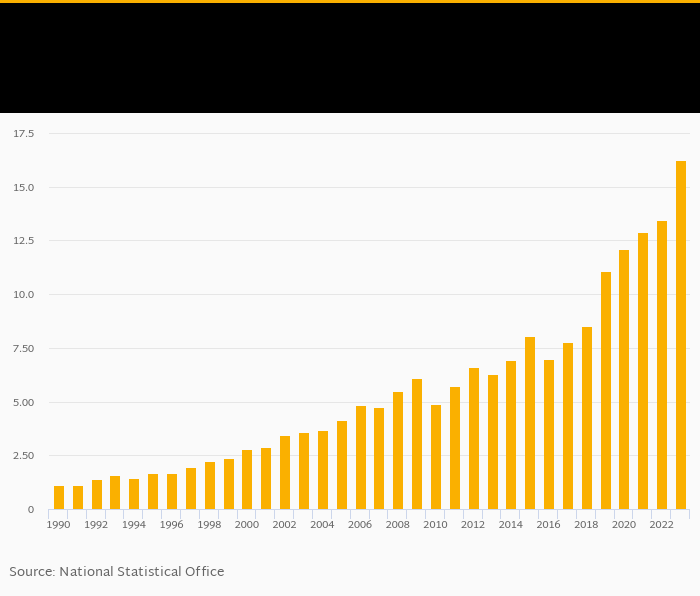 GDP per unit of energy use in PPP prices per kg of oil equivalent rose 20.9% to USD 16.2 in Estonia in 2023, according to World Bank / EIA.