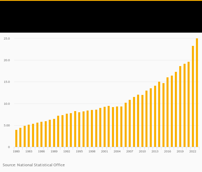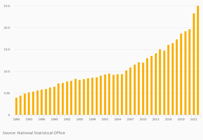 GDP per unit of energy use in PPP prices per kg of oil equivalent rose 7.10% to USD 25.0 in Italy in 2023, according to World Bank / EIA.
