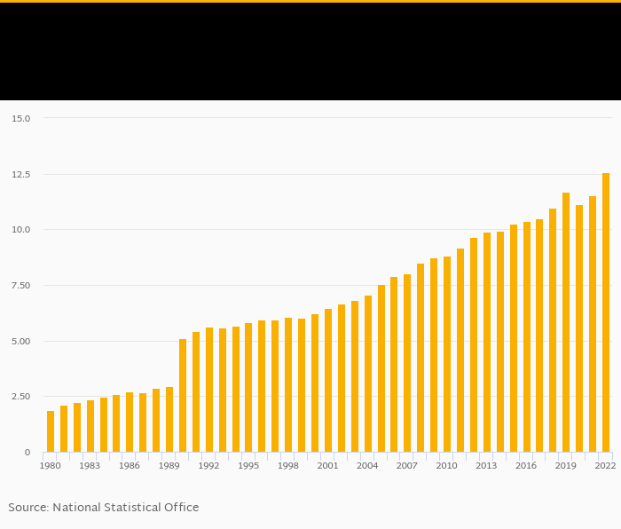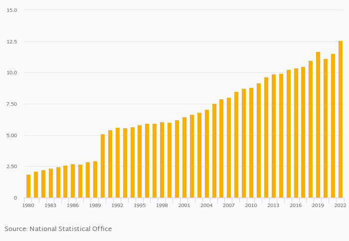 GDP per unit of energy use in PPP prices per kg of oil equivalent rose 8.97% to USD 12.6 in Pakistan in 2022, according to World Bank / EIA.