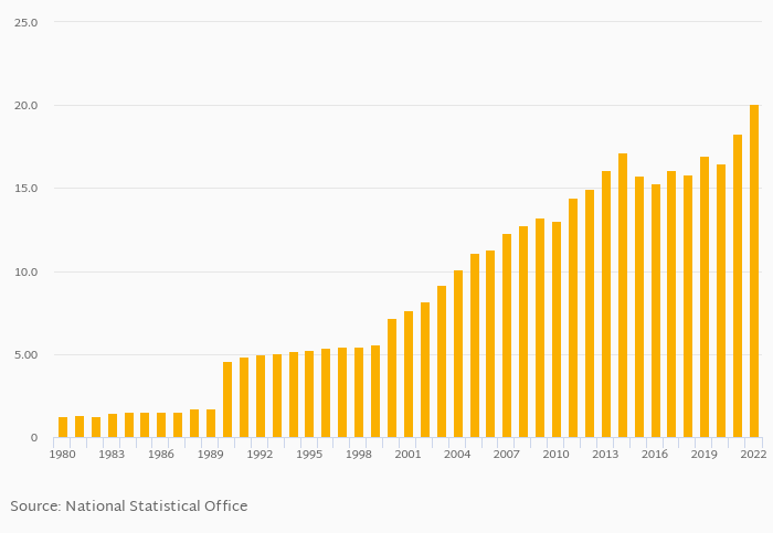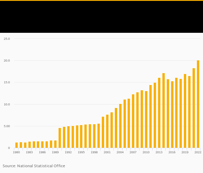 GDP per unit of energy use in PPP prices per kg of oil equivalent rose 9.93% to USD 20.1 in Ghana in 2022, according to World Bank / EIA.
