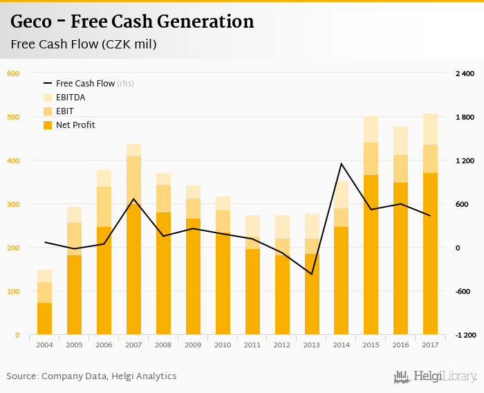 Geco made a net profit of CZK 371 mil with revenues of CZK 34,305 mil in 2017, up by 6.14% and up by 4.61%, respectively, compared to the previous year. This translates into a net margin of 1.08%.