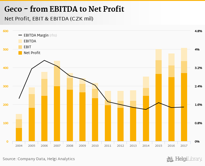 Geco made a net profit of CZK 371 mil with revenues of CZK 34,305 mil in 2017, up by 6.14% and up by 4.61%, respectively, compared to the previous year. This translates into a net margin of 1.08%.