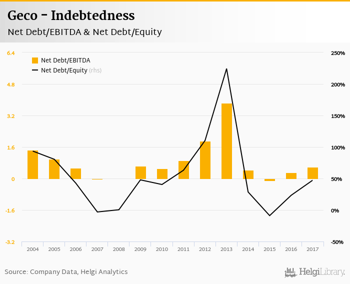 Geco's net debt stood at CZK 301 mil and accounted for 47.3% of equity at the end of 2017. The ratio is up 24.0 pp compared to the previous year.
