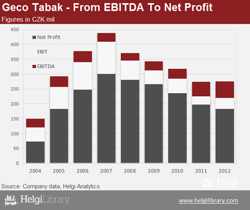 Since 2004, the Company has more than doubled its sales and net profit, to CZK 17.3 bil and CZK 183 mil, respectively, as of the end of 2012. Although operating margin halved since 2005 to 1.3% now, the Company remains impressively profitable with average ROE accounting for 40-50% in the last five years