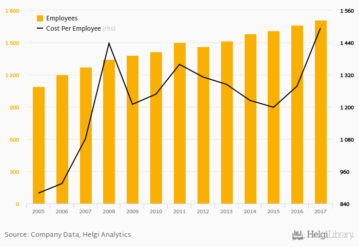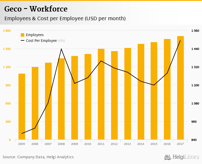 Geco employed 1,708 employees in 2017, up 2.89% compared to the previous year. Historically, between 2005 and 2017, the firm's workforce hit a high of 1,708 employees in 2017 and a low of 1,089 employees in 2005.