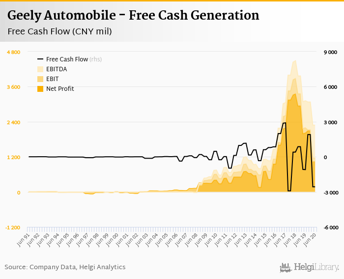 Geely Automobile made a net profit of CNY 1,148 mil with revenues of CNY 18,410 mil in 2Q2020, down by 43% and down by 23%, respectively, compared to the previous year. This translates into a net margin of 6.24%.