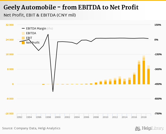 Geely Automobile made a net profit of CNY 8,190 mil with revenues of CNY 97,401 mil in 2019, down by 34.8% and down by 8.62%, respectively, compared to the previous year. This translates into a net margin of 8.41%.
