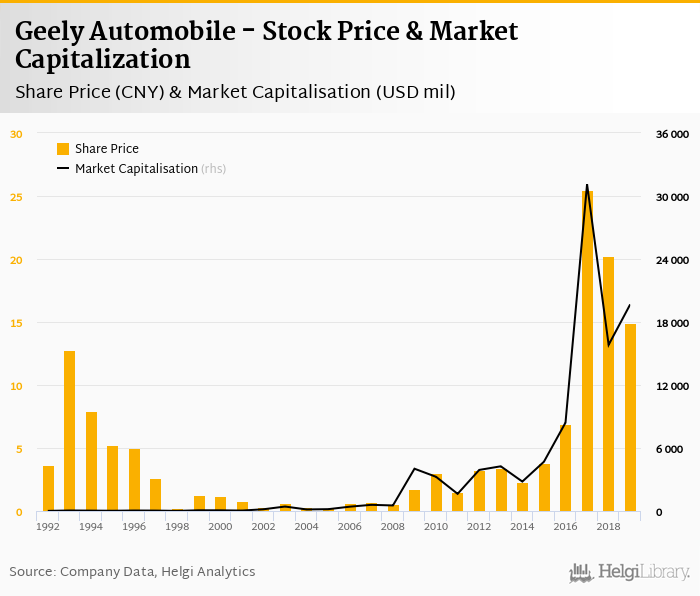 Geely Automobile stock traded at CNY 14.9 per share at the end 2019 implying a market capitalization of USD 19,677 mil.