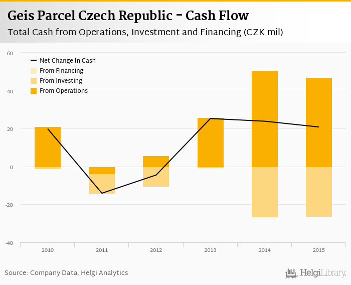 Geis Parcel Czech Republic's operating cash flow stood at CZK 47.1 mil in 2015, down 6.66% when compared to the previous year. Historically, between 2010 - 2015, the firm’s operating cash flow reached a high of CZK 50.4 mil in 2014 and a low of CZK -3.87 mil in 2011.